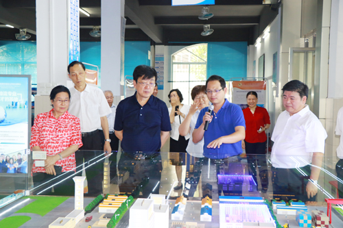 图为谢俐(左三)、那佳(左一)、陈宣群(左二)等在听取两位董事长关于校园总体建设情况介绍