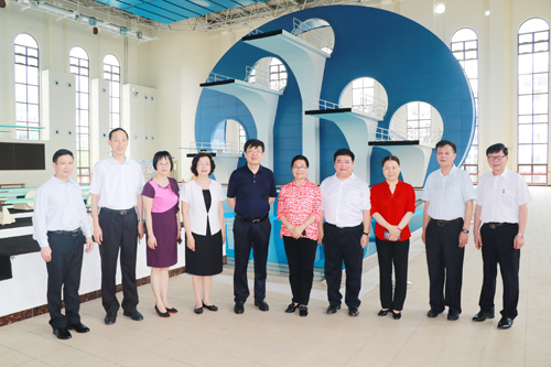 图为谢俐(左五)、那佳(左四)、陈宣群(右三)等在跳水游泳馆合影留念
