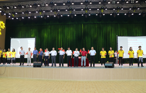 图为市领导、学校领导上台齐唱《我和我的祖国》