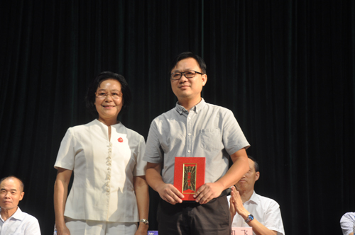 图为谢建平为余庆兰颁奖