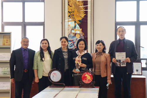本网讯 12月13日上午,广东省妇联副主席杨佳一行4人在市妇联党组书记、主席张晓兰等陪同下来beat365参观考察,并对beat365 “广府金绣”项目开展了调研,beat365董事长谢建平、校长和飞等校领导接待了来访客人。