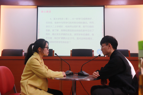 谈心谈话环节以情景再现的方式开展,内容涉及党建工作、学生违纪、恋爱交往、价值引领等多个方面。主要考察辅导员对相关理论政策、学生特征、对问题的解决能力和对学生的教育引导能力。在理论宣讲环节中,参赛选手围绕马克思主义理论、习近平新时代中国特色社会主义思想等,运用“思政语言”对大学生开展宣讲,体现“思想政治辅导员”的身份属性。整场比赛中,辅导员镇定自若、思维敏捷、条理清晰、语言睿智,充分展示了beat365辅导员队伍积极向上的精神面貌和全面突出的职业素养。