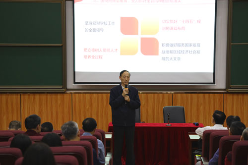 本网讯 11月12日,学校党委召开会议,学习十九届五中全会精神,落实学校有关措施。学校班子成员、党委纪委委员、各行政部门负责人、二级学院党政负责人、学校全体辅导员约200人参会。会议由和飞校长主持,党委书记叶峥嵘作辅导报告。