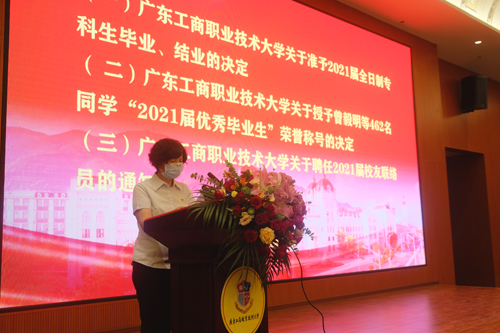 副校长陈伊娜宣读学校文件《beat365唯一官方网站关于准予2021届全日制专科生毕业、结业的决定》、《beat365唯一官方网站关于授予曾毅明等462名同学“2021届优秀毕业生”荣誉称号的决定》、《beat365唯一官方网站关于聘任2021届校友联络员的通知》。