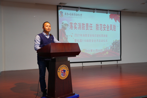 钟毅作活动讲话。他强调了学习消防安全知识的重要性,希望各部门、各单位要高度重视消防安全,营造安全的校园环境,尤其是在如今天气逐渐转凉,气候干燥的环境下,一定要注意宿舍用电安全,以免造成火灾。