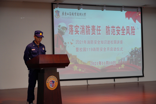 本网讯 11月10日,消防安全知识进校园讲座暨校园“119”消防安全月启动仪式顺利举行,该活动由大旺校区后勤保卫处主办、消防救援学院协办。校区党委书记、学生处处长钟毅,后勤保卫处副处长柯其寅、消防救援学院朱先斌、宿管中心主任甘文等出席了本次活动,参加活动的还有校区行政人员、消防救援学院学生、学生会干部、学生志愿者、学校服务单位人员及东方亮物业人员。