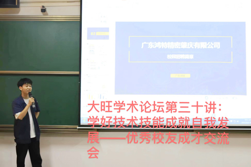 本网讯 5月25日下午,大旺校区学术论坛第三十讲在教学楼416顺利开讲,本次讲座邀请了广东宏特精密技术有限公司人事处何女士以及玛西尔公司盘嘉杰分别作为公司职业规划宣导员和优秀校友代表来校分享职业成长之路的知识和经验。此次讲座旨在让学生明确职业方向,从而更好地规划大学生活,实现自身的价值和理想。