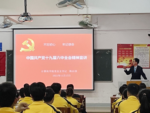 11月17日晚上,计算机学院教师党支部、学生党支部和人工智能与大数据学院师生党支部全体党员及发展对象集体学习中国共产党十九届六中全会精神,计算机学院党总支书记韩治国做专题辅导讲座。