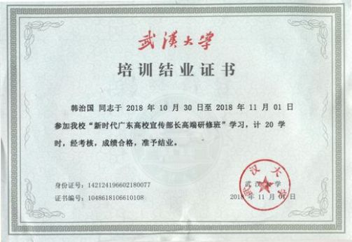 图为韩治国研修班结业证书