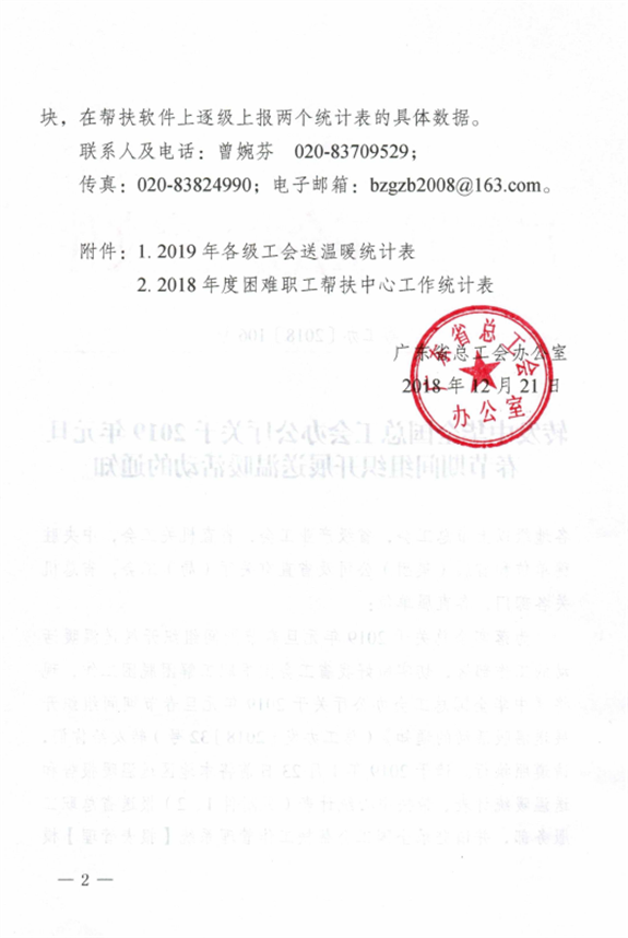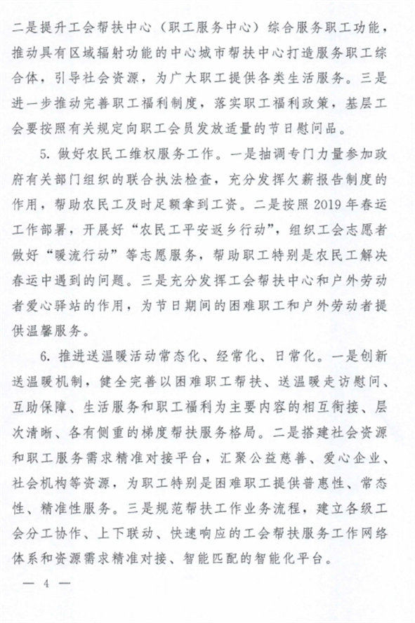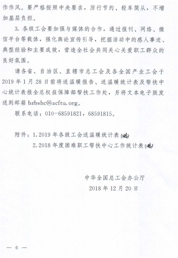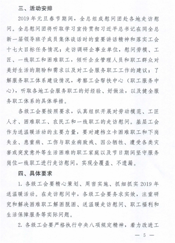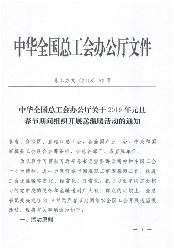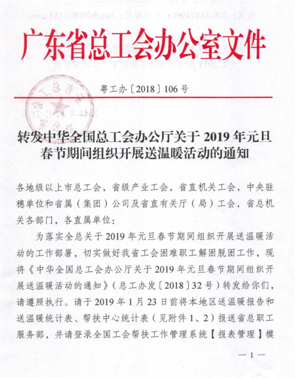 为做好2019年元旦春节期间送温暖活动,现将《转发中华全国总工会办公厅关于2019年元旦春节期间组织开展送温暖活动的通知》(粤工办〔2018〕106号)转发给你们,请按通知要求认真贯彻落实。