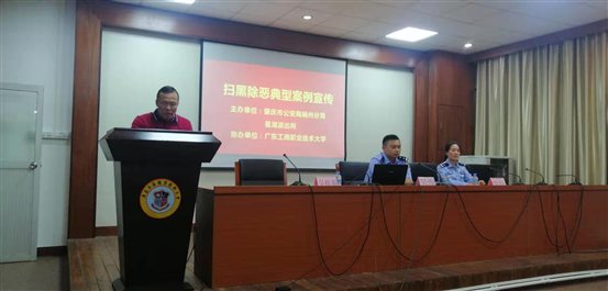 为了更深刻更具体进行典型案例宣传,在肇庆市公安局端州区分局指导下,由辖区星湖派出所在校安排了一次扫黑除恶典型案件宣传讲座。在讲座里资深办案警官分析了全国上下扫黑除恶的态势及取得的成果。讲述一些发生在肇庆范围内的黑势力团伙被打掉的情况,还深入浅出分析了非法网贷之“校园贷”如何衍生成“套路贷”及“套路贷”的危害,还播放了真实“套路贷”案件视频,让学生更清晰了解校园贷的危害,从而领悟到黑恶势力就发生在身边,进而增强防范黑恶势力。
