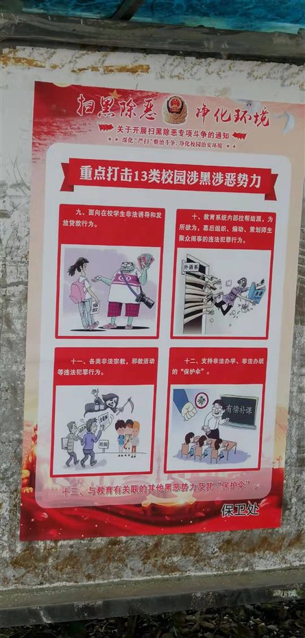 在宣传栏张贴图文并茂的有关扫黑除恶的海报。在校园主干道及宿舍区内悬挂标语横额,在放学时段派发宣传单张,通过此举营造了人人关注的氛围,为进一步开展扫黑除恶宣传打下基础。
