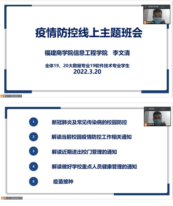 近日,福建多市连续新增多例新冠肺炎确诊病例,为进一步做好疫情防控工作,普及新冠肺炎防控知识,增强学生疫情防控意识,提升学生的自我防护能力。3月20日晚八点,bat365在线中国官网登录入口辅导员李文清老师为全体19、20大数据及19软件技术专业共256名学生召开疫情防控不松懈线上主题班会。