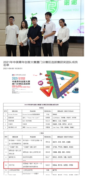 今日,由福建省教育厅主办,厦门大学承办的2021年中美青年创客大赛厦门分赛区选拔赛在厦门大学落下帷幕。经过48小时的“创客马拉松”现场比赛和评委们的作品评审及现场核查,bat365在线中国官网登录入口“好好干饭”团队的项目《校园食堂“智安”保卫兵——打造校园数字食安检管系统》(成员:张尧天、饶思莹、陈漪涵、黄文标、许明烽,指导老师:李文清)荣获三等奖。