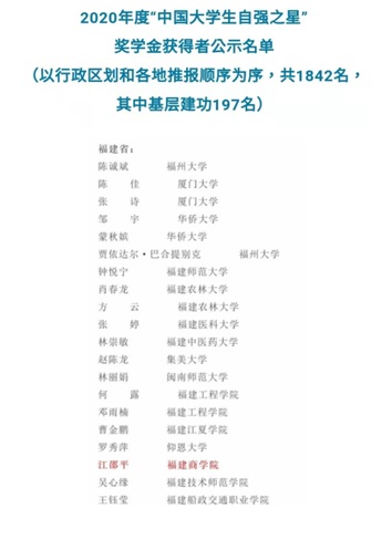近日,由共青团中央、全国学联指导,中国青年报社、新东方教育科技集团联合开展的“青春自强奋勇争先”2020年度“中国大学生自强之星”奖学金评选结果揭晓,bat3652019级数据科学与大数据技术专业江邵平同学获2020年度“中国大学生自强之星”奖学金。
