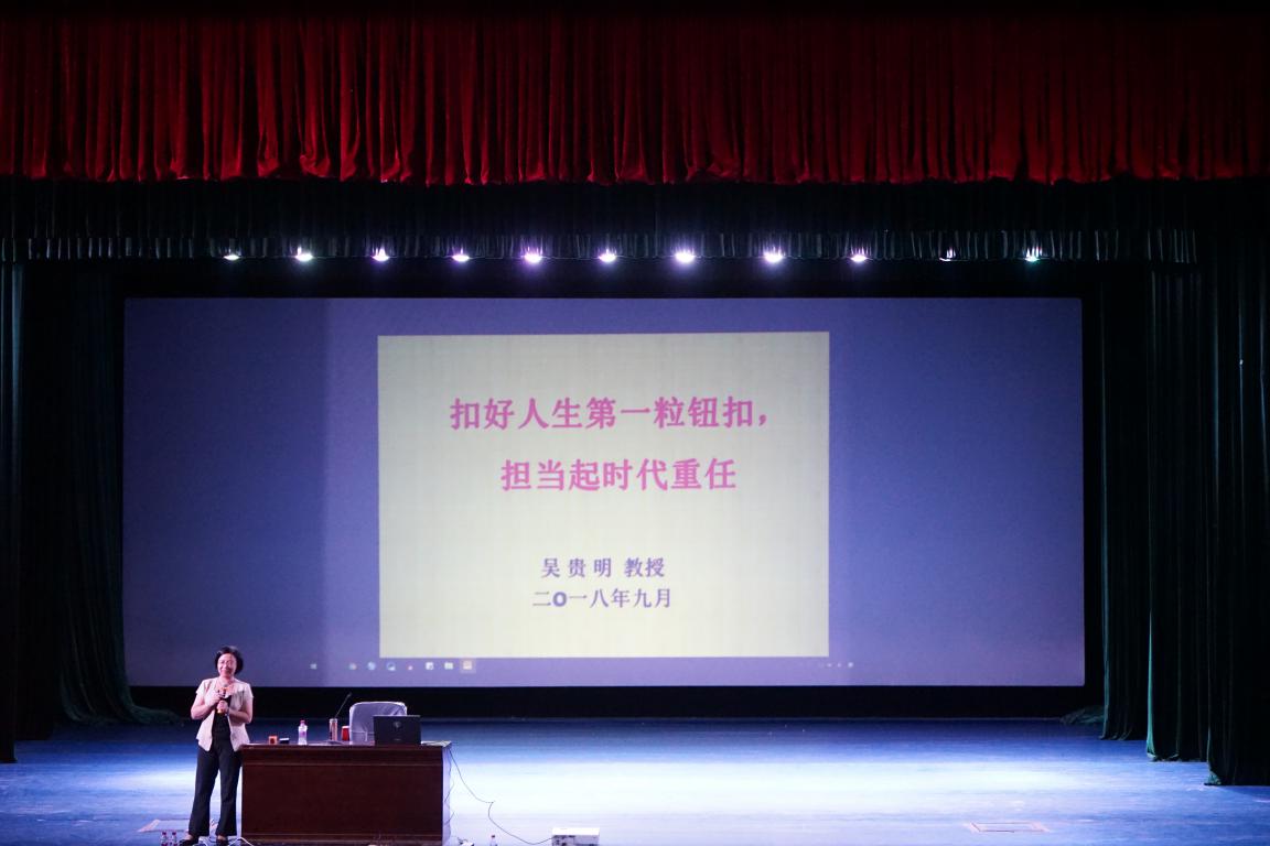 吴贵明教授在报告会上与师生们一起重温“两个一百年”奋斗目标。她说,当前我国正处于实现“两个一百年”奋斗目标的关键时期,正是广大青年奋发有为,实现人生理想和自我价值的美好新时代。希望每个人都要主动担负起新时代赋予当代青年的重任,珍惜大学时光,扣好人生第一粒纽扣,认真学习,努力实践,不断提高思想水平,优化知识结构,树立正确的世界观、人生观和价值观,用奋斗开启美好人生路。她还说,人生道路是条单行道,三到四年的大学时光看似很长,但真正用于学习的时间并不多,每个人都必须珍惜时光,知行合一,有目标、有思考、有坚持地完成学习任务,通过勤奋学习,求得真学问,练就真本领,做一名实干家,不给美好的大学时光留下遗憾。